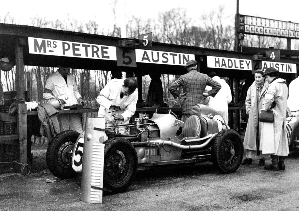 Racing star, Kay Petre in the pits at Donington Park in 1937 driving an Austin Seven in the British Empire Trophy.