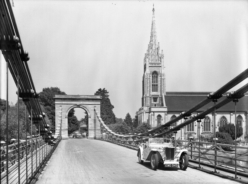 Pictured here at Marlow Bridge, Buckinghamshire , this TC Midget was the first post-war MG launched in 1945.