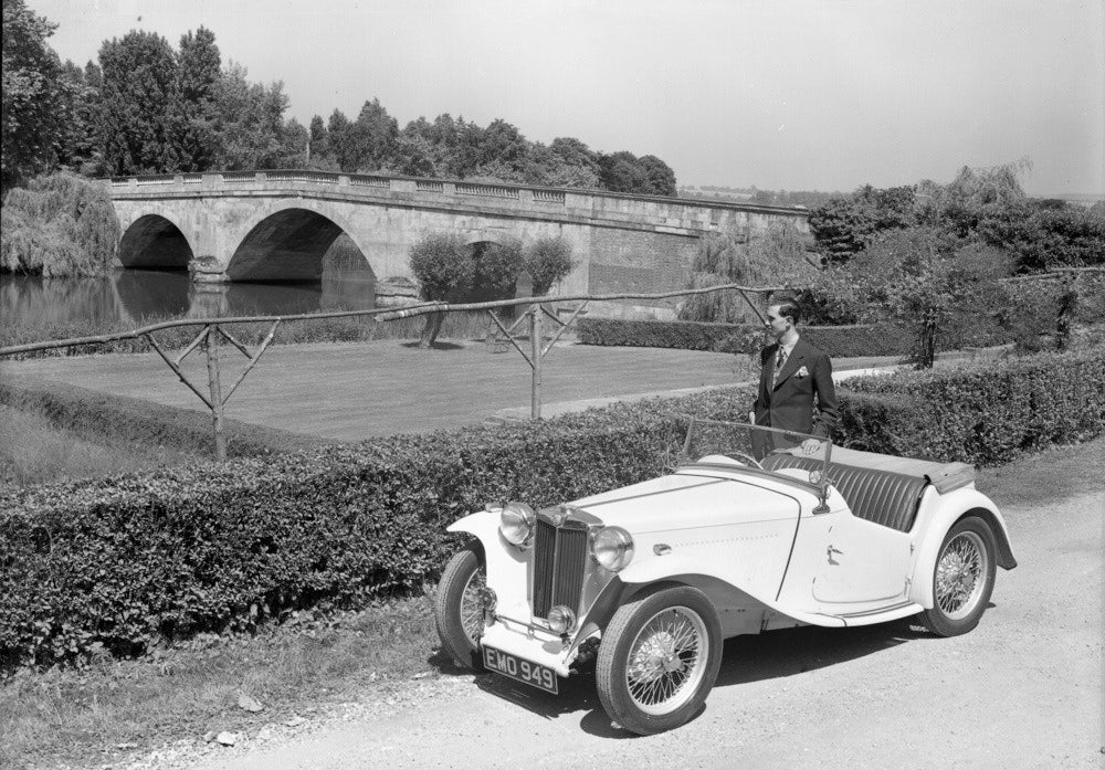 A crisp, white MG TC Midget pictured at Shillingford Bridge in Oxfordshire, not far from the MG Factory in Abingdon with a gentleman driver dressed to impress!