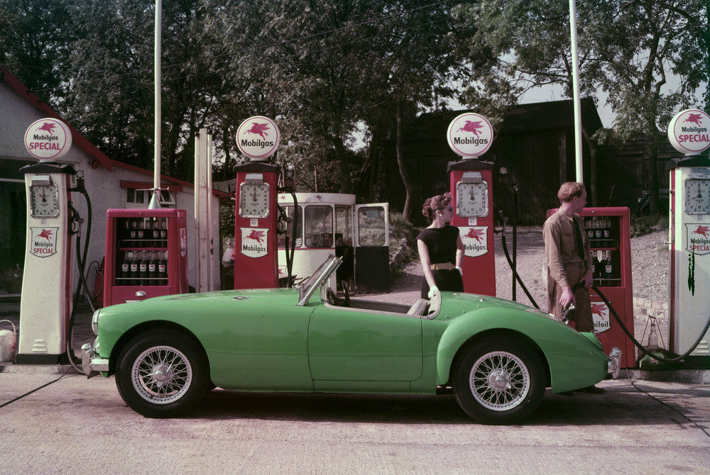 The bright green MGA 1500 Roadster is filling up at a 1950s petrol station with two stylishly dressed passengers.