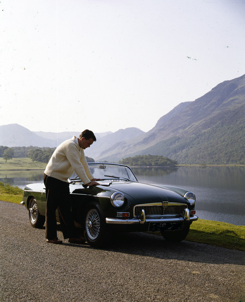 The MGB roadster was the first of the MGB range to be produced and the MGB Roadster was produced by the British Motor Corporation between 1962 to 1980. This little number is parked up by a calm looking lake and scenic hillside.