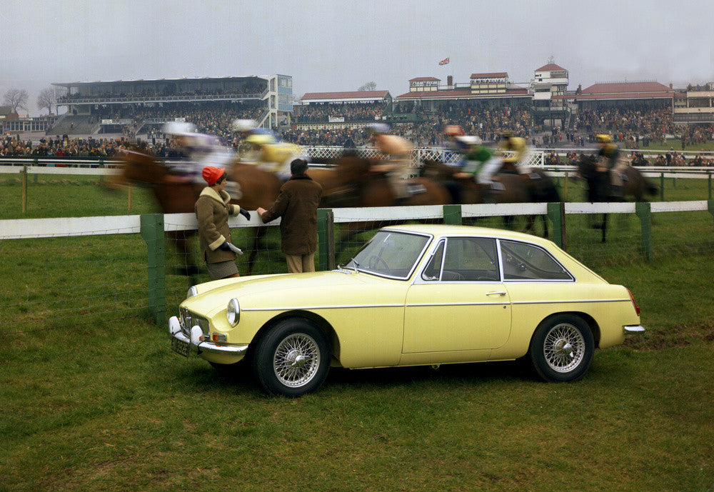 A yellow MGB GT 1967 is parked up by a racecourse fence as two racegoers stand on excitedly to watch the horses speedily gallop pass midway through the race.