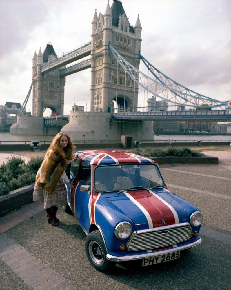 The iconic fashion model, Twiggy stands next to a Union Jack painted Mini in 1978 in front of London Bridge.