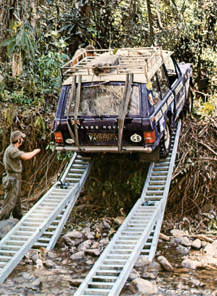 The Range Rover had only recently been launched in 1970 and this British Trans America Expedition from 1971-1972 was devised to prove the vehicle's off-road capabilities in the tradition of the Land Rover. Two Range Rovers travelled from Alaska to Cape Horn crossing the Darien Gap in Central America. This photograph therefore focuses on the expedition crew crossing the river at the Darien Gap using ladders and a dinghy