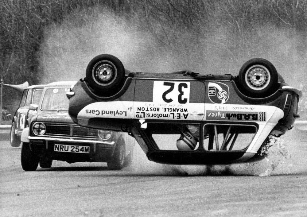 This picture is from the Leyland National Mini Championship 1977 held at Castle Combe, Chippenham. The Mini 1275 GT driven by Malcolm Leggarte crashes dramatically onto its roof taking him out of the race...