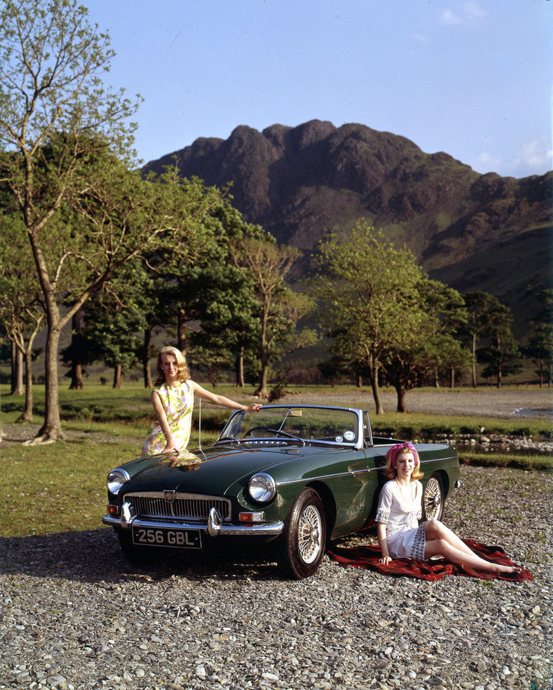 MGB Roadster 1965 on shoot in the Lake District with fashion models. Registration mark: 256 GBL.