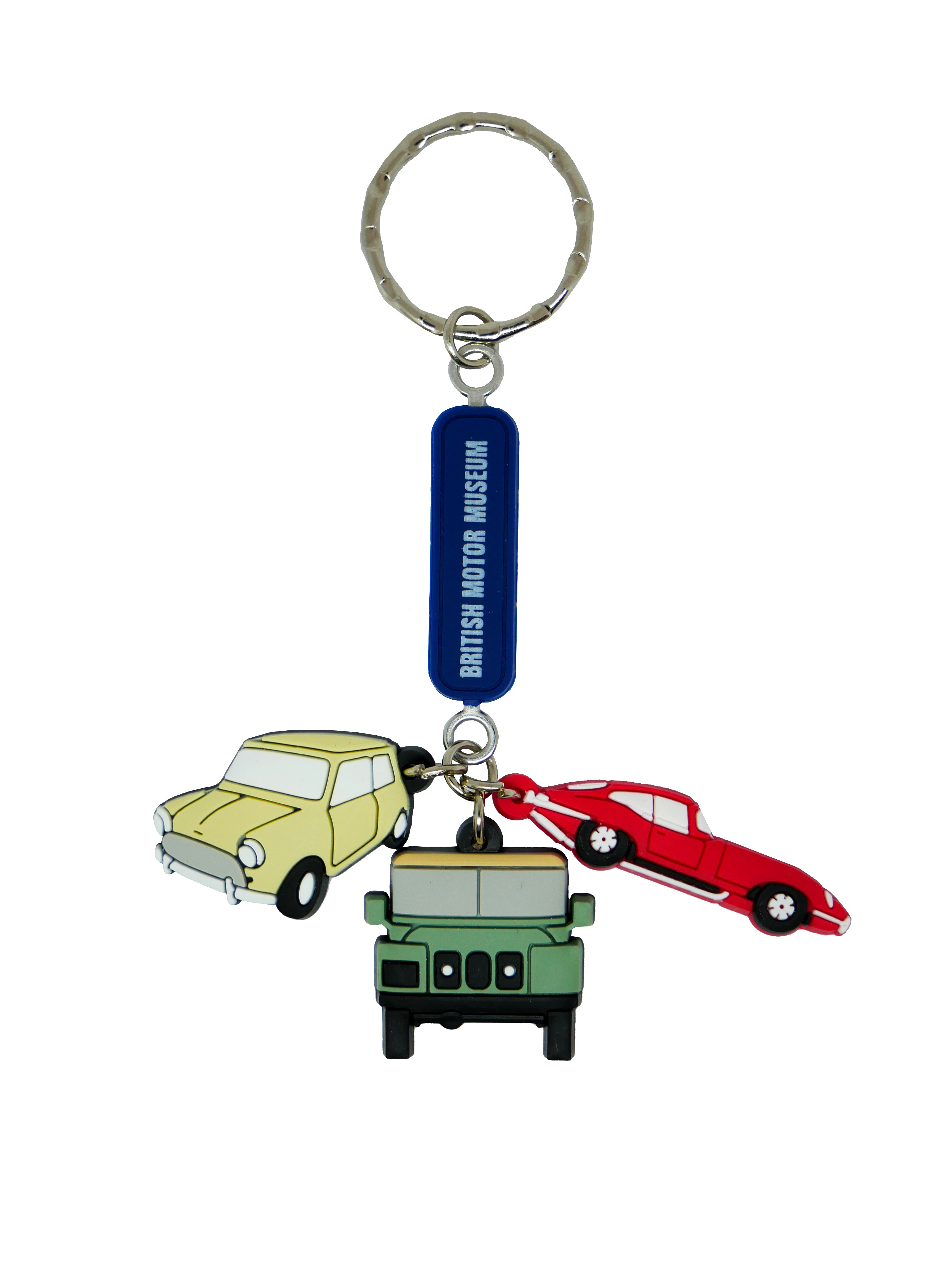 The Mini, the E-Type Jaguar and the Land Rover. These three cars are attached to a blue bar displaying the British Motor Museum name.