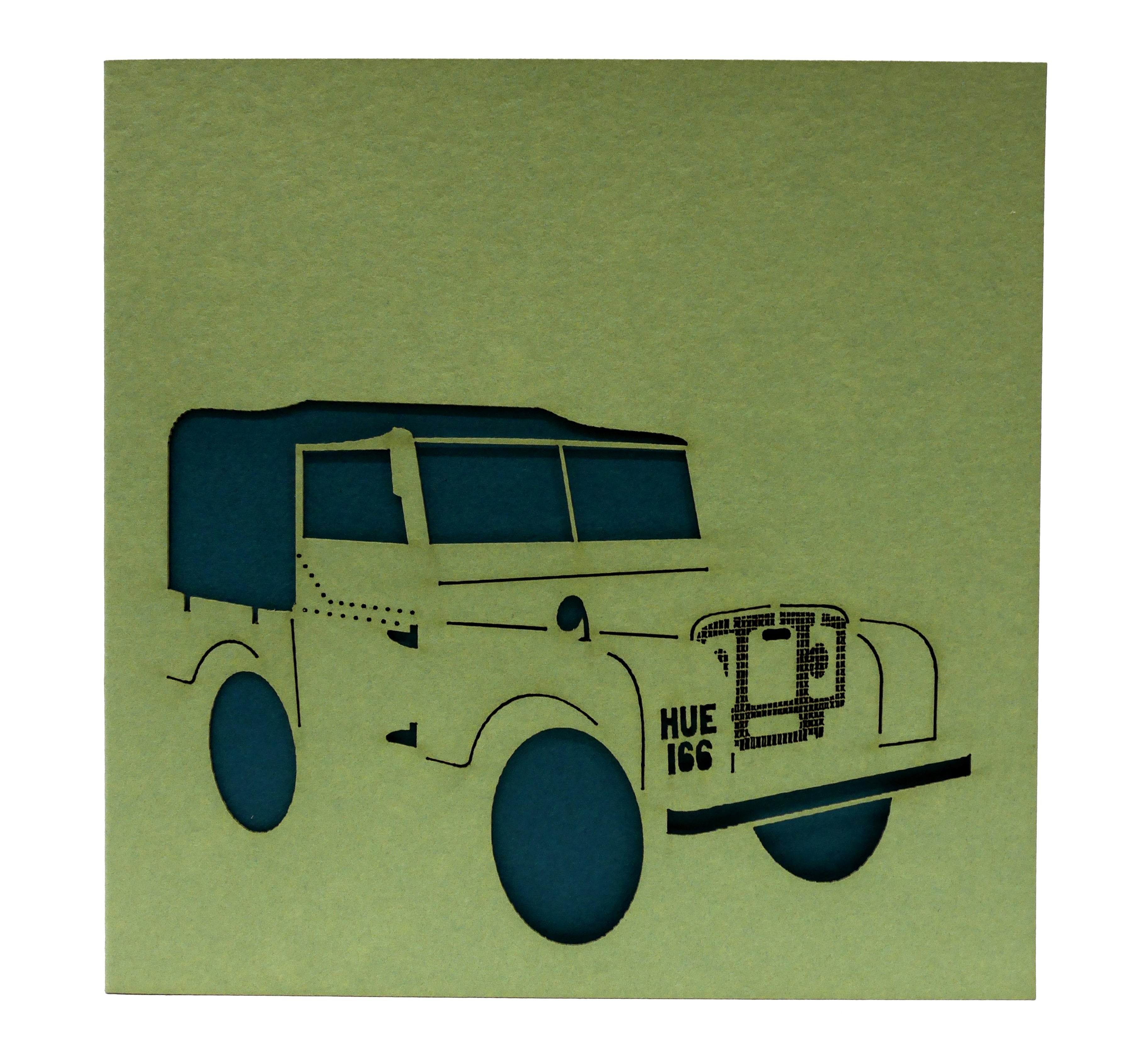 This bespoke, laser cut greetings card in light green and evergreen depicts the first pre-production Land Rover Series 1 Model 1948. Affectionately called 'Huey' after the vehicle's registration, HUE 166, this car is currently on display in the British Motor Museum's collection.