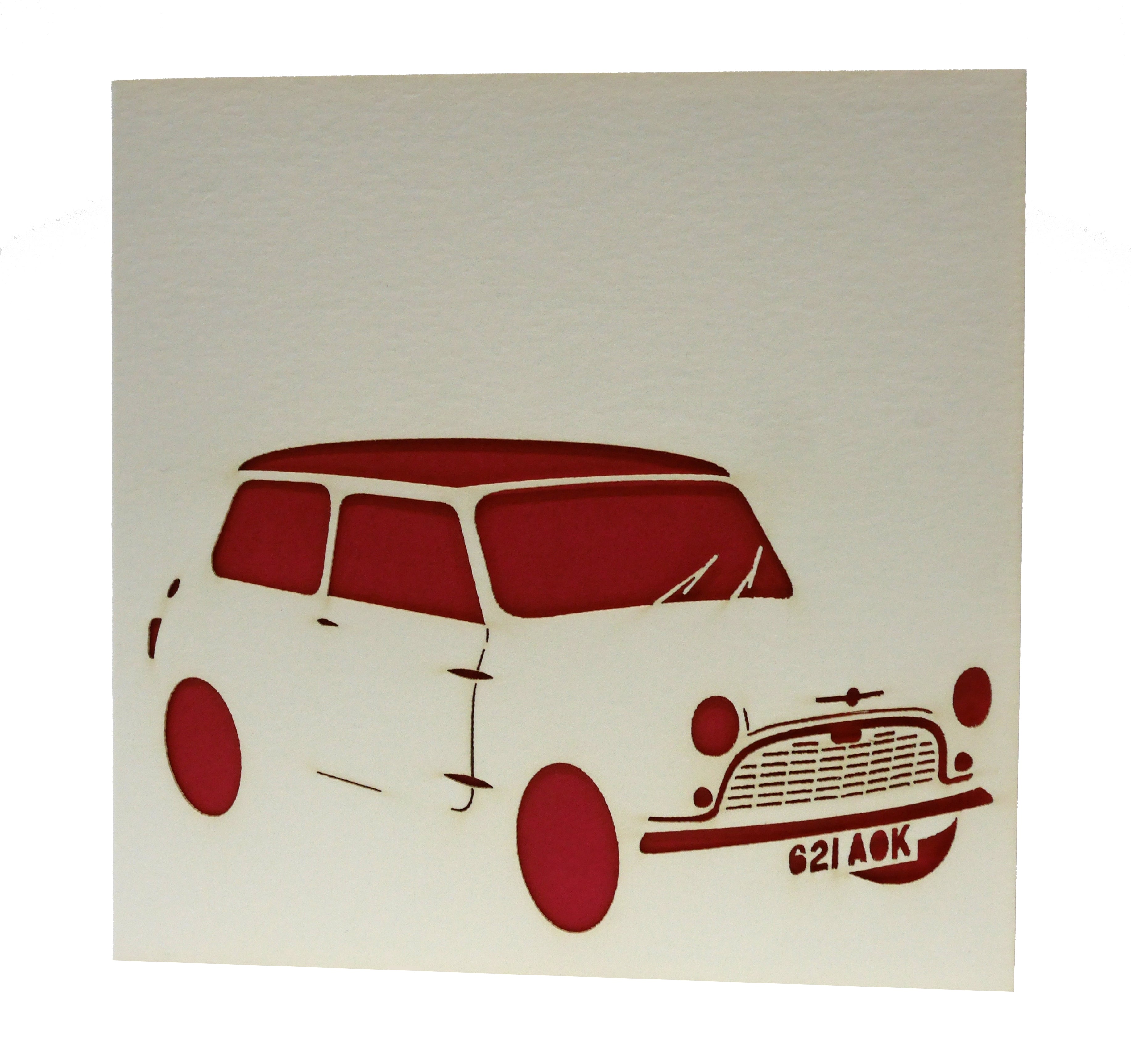 This bespoke, laser cut greetings card in cream and red depicts the 1959 First production Morris Mini-Minor with the registration '621 AOK'. Designed by Alec Issigonis, this was the first Morris badged Mini and is currently on display in the British Motor Museum's collection.
