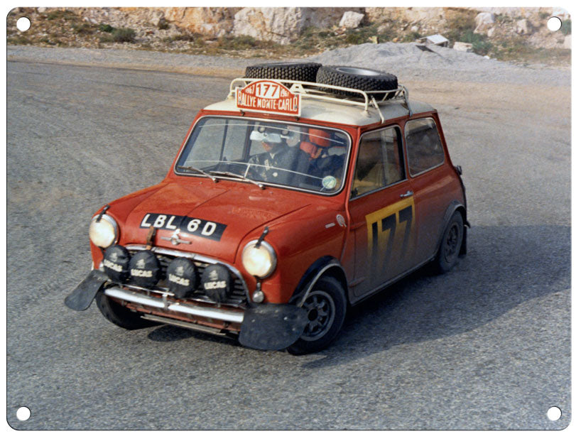 This bespoke, metal sign depicts a Morris Minor Mini Cooper S driven by Rauno Aaltonen and Henry Liddon at the Monte Carlo Rally in 1967.